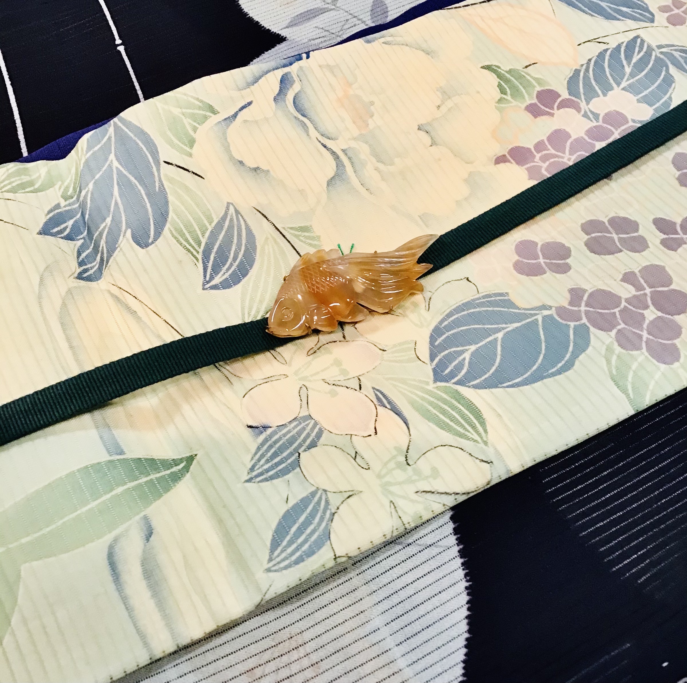 合わせた帯は、紫陽花や牡丹、朝顔、沢瀉など春から夏の季節の花々が描かれた夏帯です。