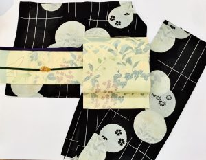 間垣にフワッと蛍の光のように浮かぶ丸紋の中に、秋草文様がそれぞれ入っています。