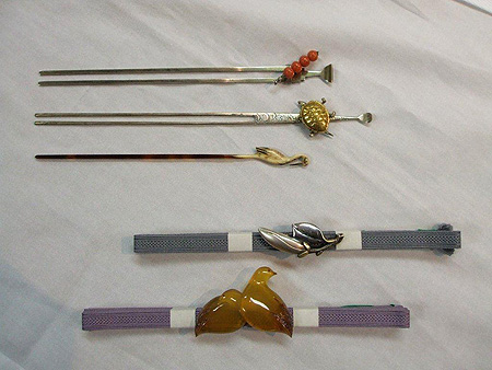 また、長寿を約束してくれそうな銀製の亀のかんざしは、なんと手足と首が小刻みに動く細工となっていて、柄には波頭も彫られ、遊び心と格調高さの両方が備わっています。