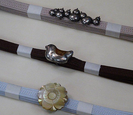 帯留は桜の染帯などに合わせても存在感のある、銀製の瓢箪や鳩のモチーフ。