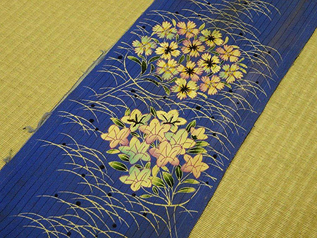 半衿で気分転換 コメントを残す 梅雨入りを迎え、毎日、蒸し暑い日が続いております。 そんな時は、半衿で気分転換はいかがですか? ご紹介します半衿は、露芝に撫子と桔梗の華やかなアンティーク半衿です。 露芝文様は、日本画家・鏑木清方も愛好した儚さをあらわした柄だそうです。 「脆いもののもつ美しさも、色々取り上げられるが、露をこすものはなかろう」と述べたほど。 その上に秋の七草である可憐で優美な撫子と桔梗を華やかに配してあります。 日本の情緒を、この一枚で充分楽しめる一枚です。 徳永