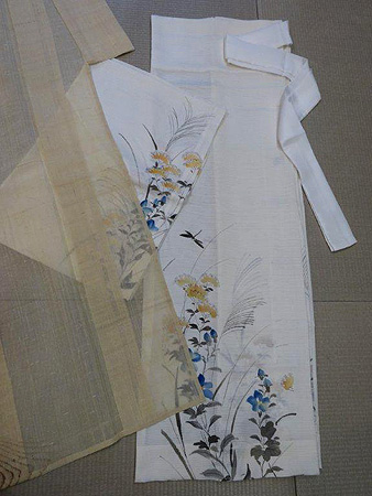 白の絹絽に秋草花とトンボが描かれています。