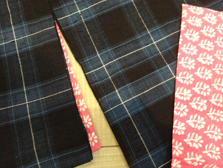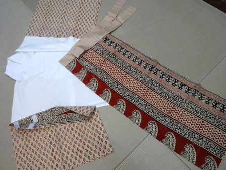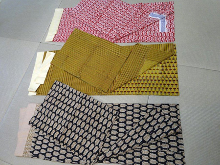 袖と裾除けは、写真のインドサリー布で作ったものの他にも、夏物や袷着物にふさわしい麻、木綿、絹と素材もさまざまご用意しています。