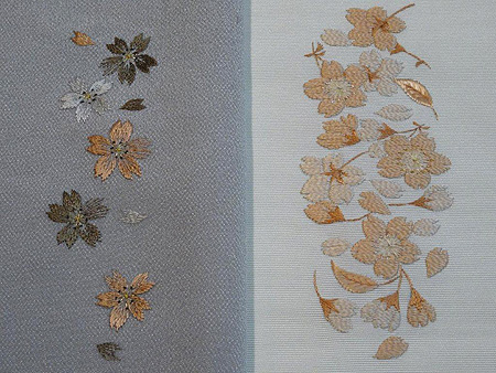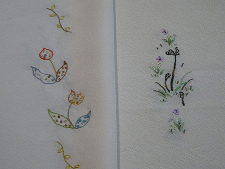 花の半衿 可愛らしい刺繍の半衿です。 お顔のそばにそっと、春の花を咲かせてあげて下さいませ。 グレー地に桜の半衿 8,640円 白地に桜の半衿 12,000円 チューリップのビーズ半衿 7,350円 スミレとワラビの半衿 12,600円 海老沢
