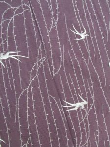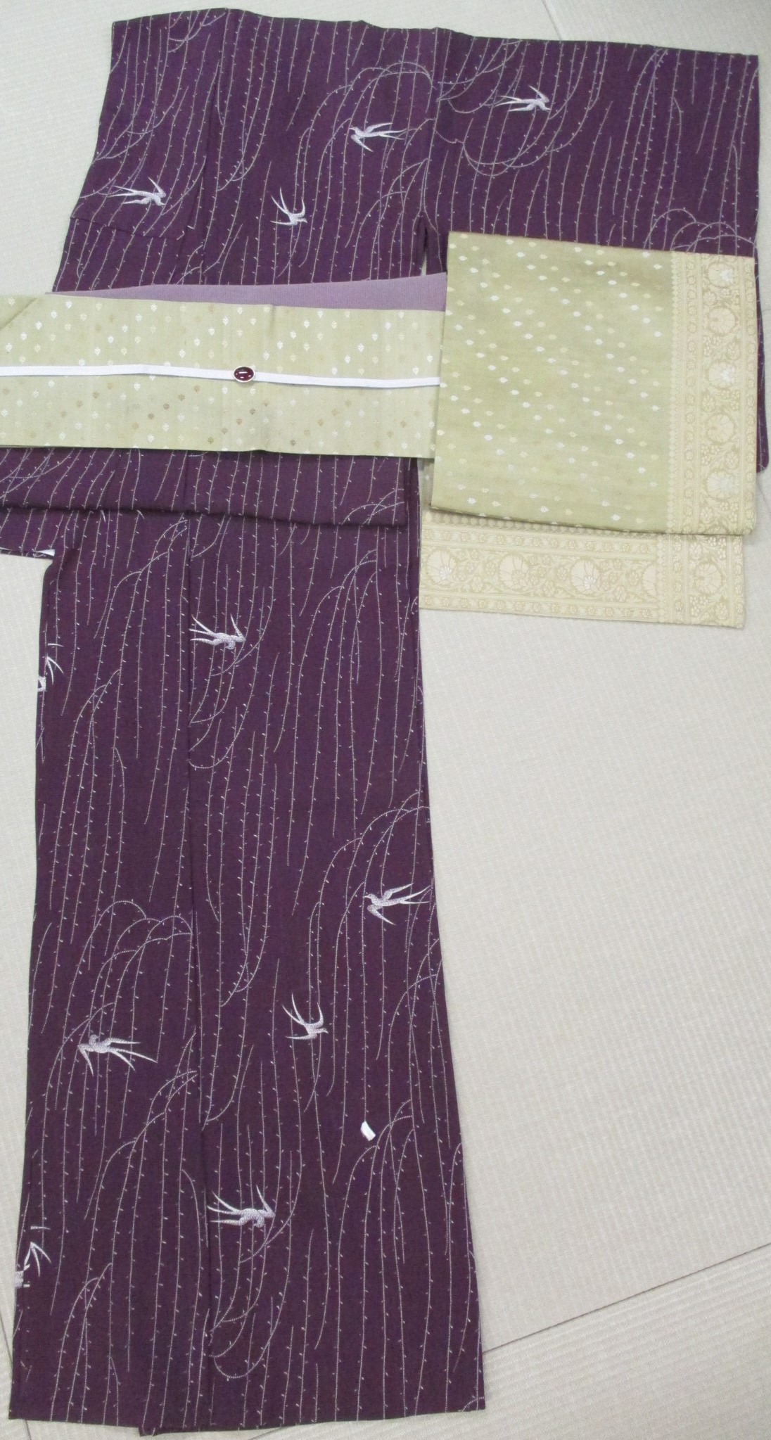 着物は、帯のごく薄い黄緑色「柳色」に合わせて、柳にツバメ柄の絽の小紋。湿気ある曇空に揺れる柳の葉、まるでシルクロードを渡ってインドの香りをツバメが運んできてくれたかのようです。