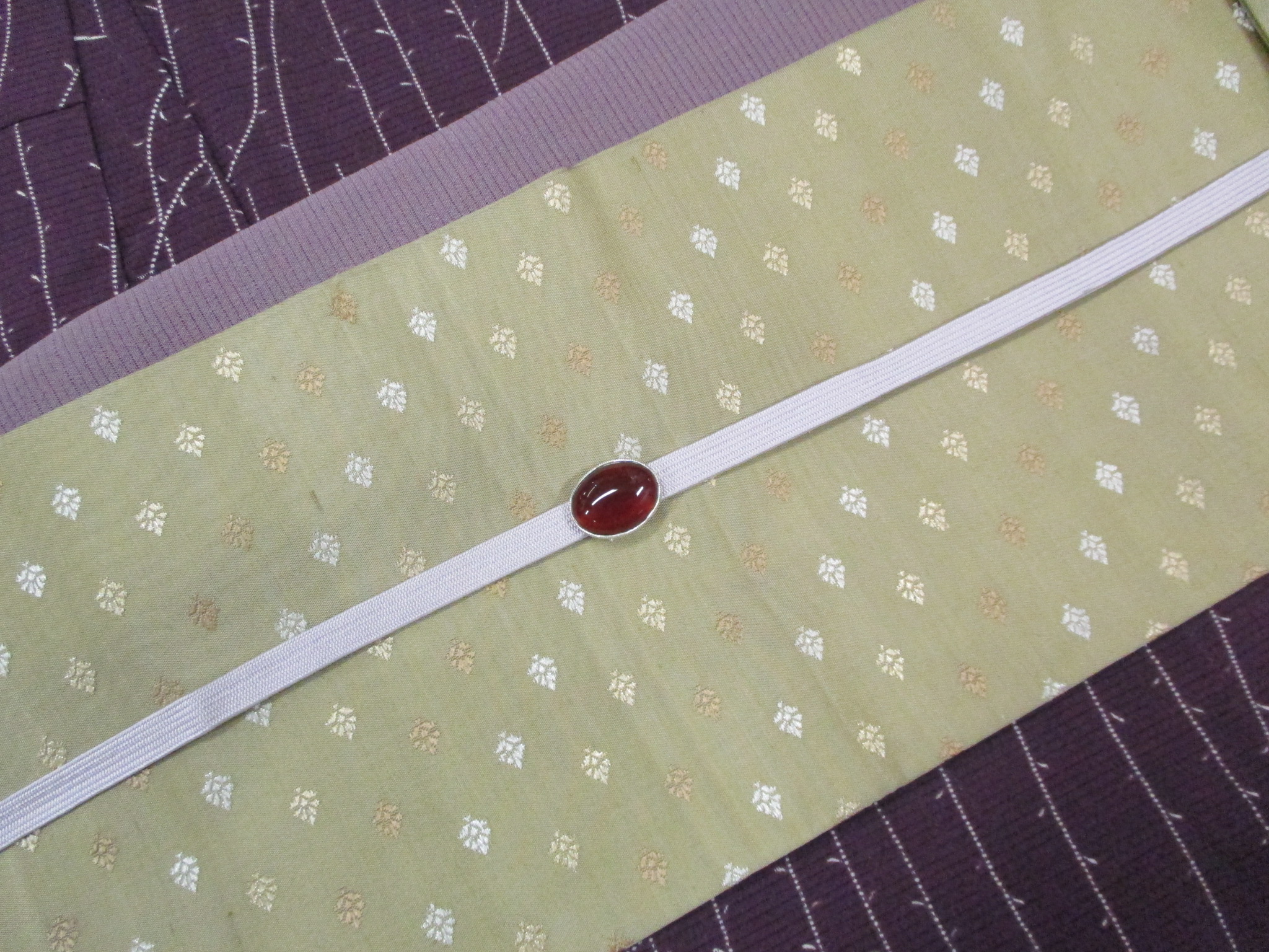 そんな時に重宝しそうな帯、インドのベナレスシルクの布でお仕立てした帯。インドサリーとしても有名ですね。絹の光沢と軽さが感じられ、真夏以外の少し汗ばむ今時期にも使いやすい帯です。金糸などで唐花模様が織り出されており、異国情緒あふれる華やかさを醸し出しています。