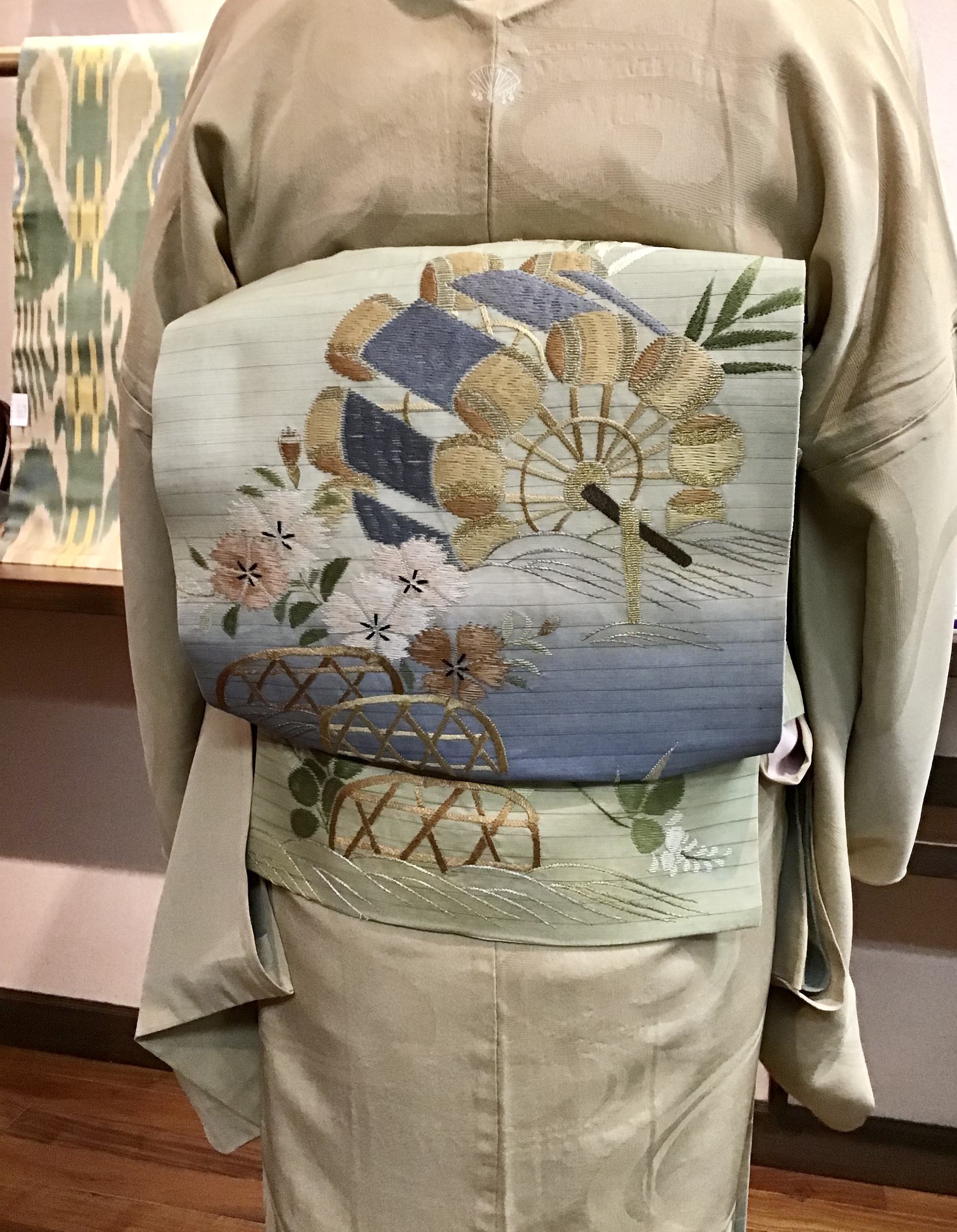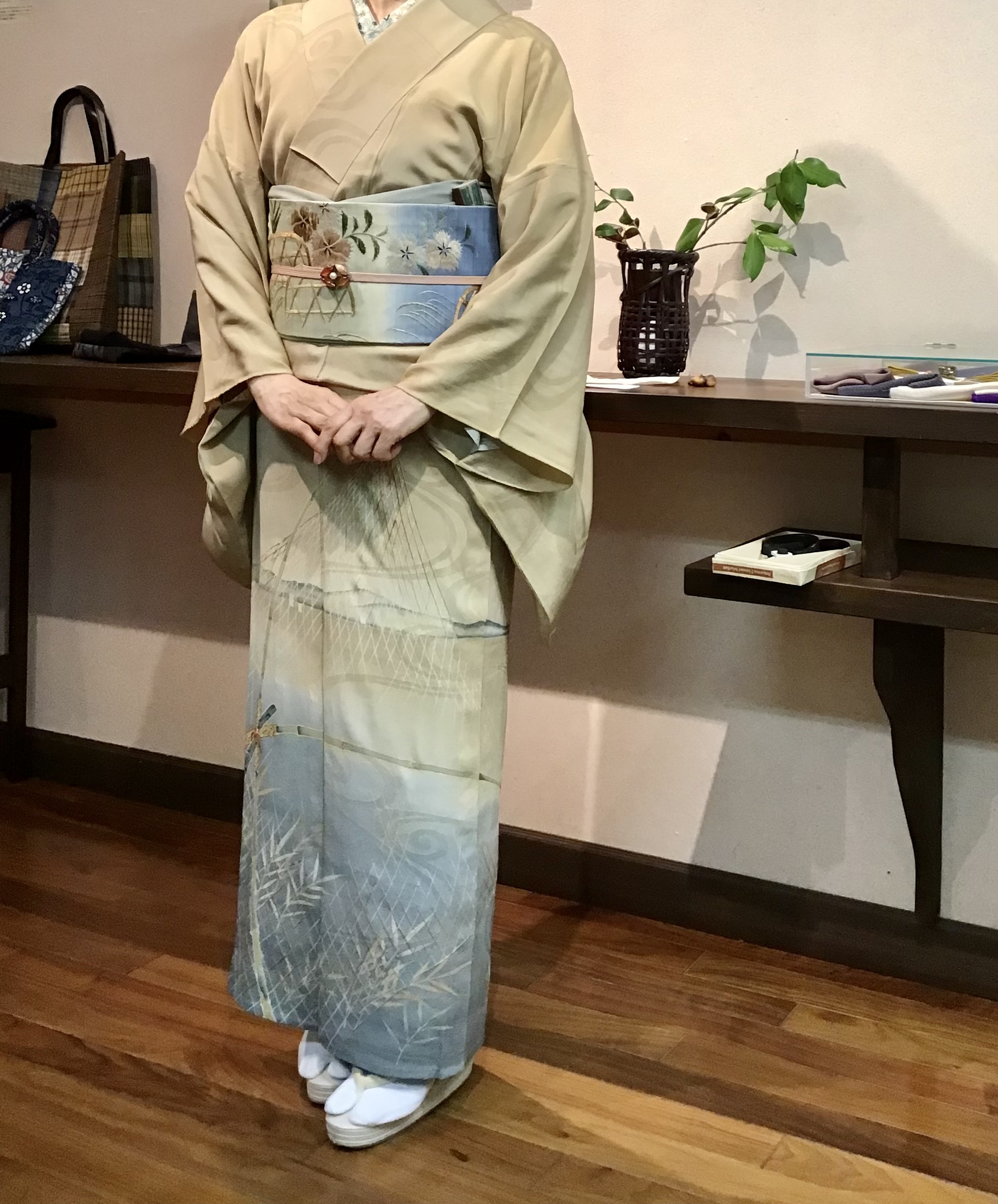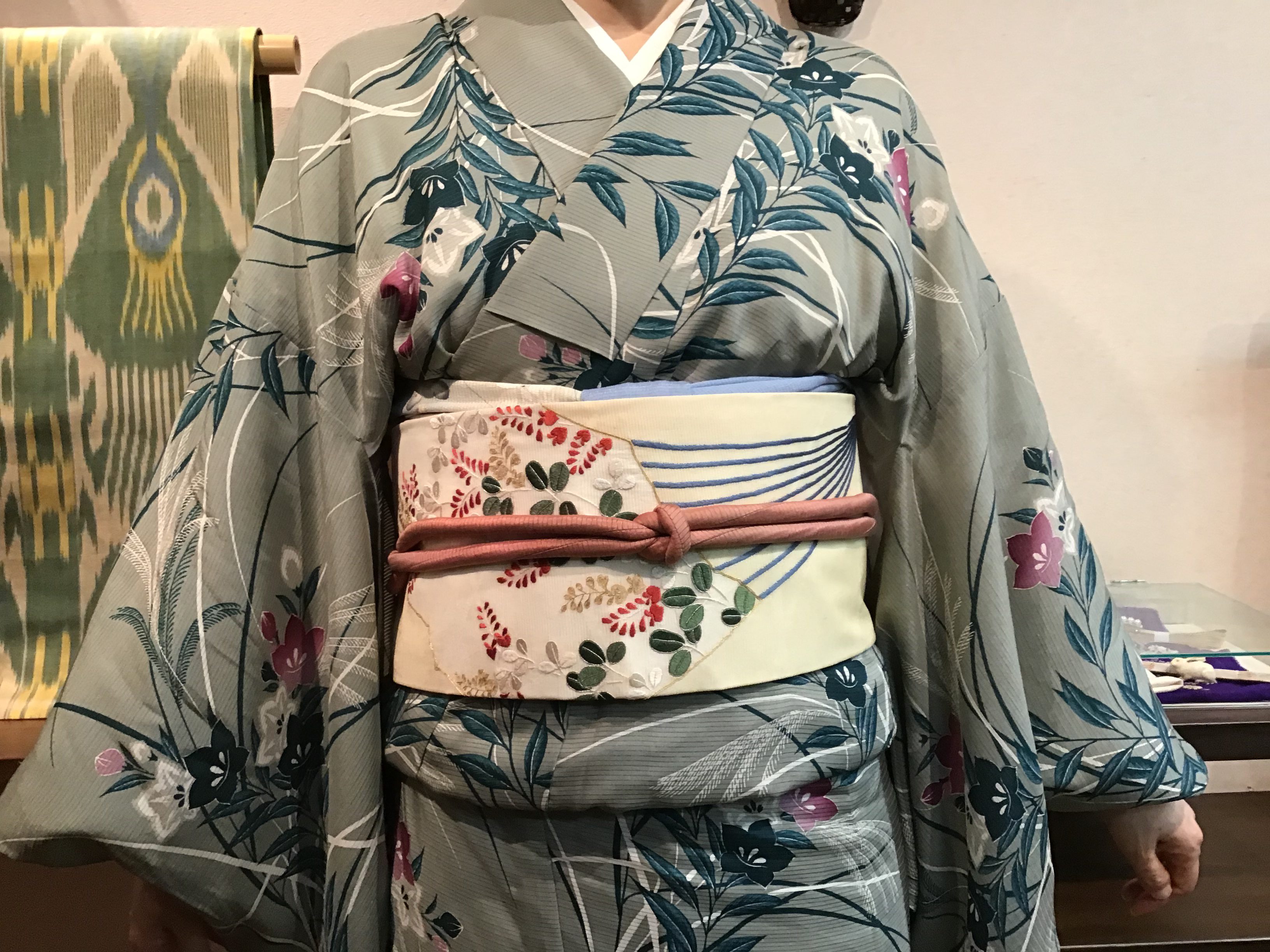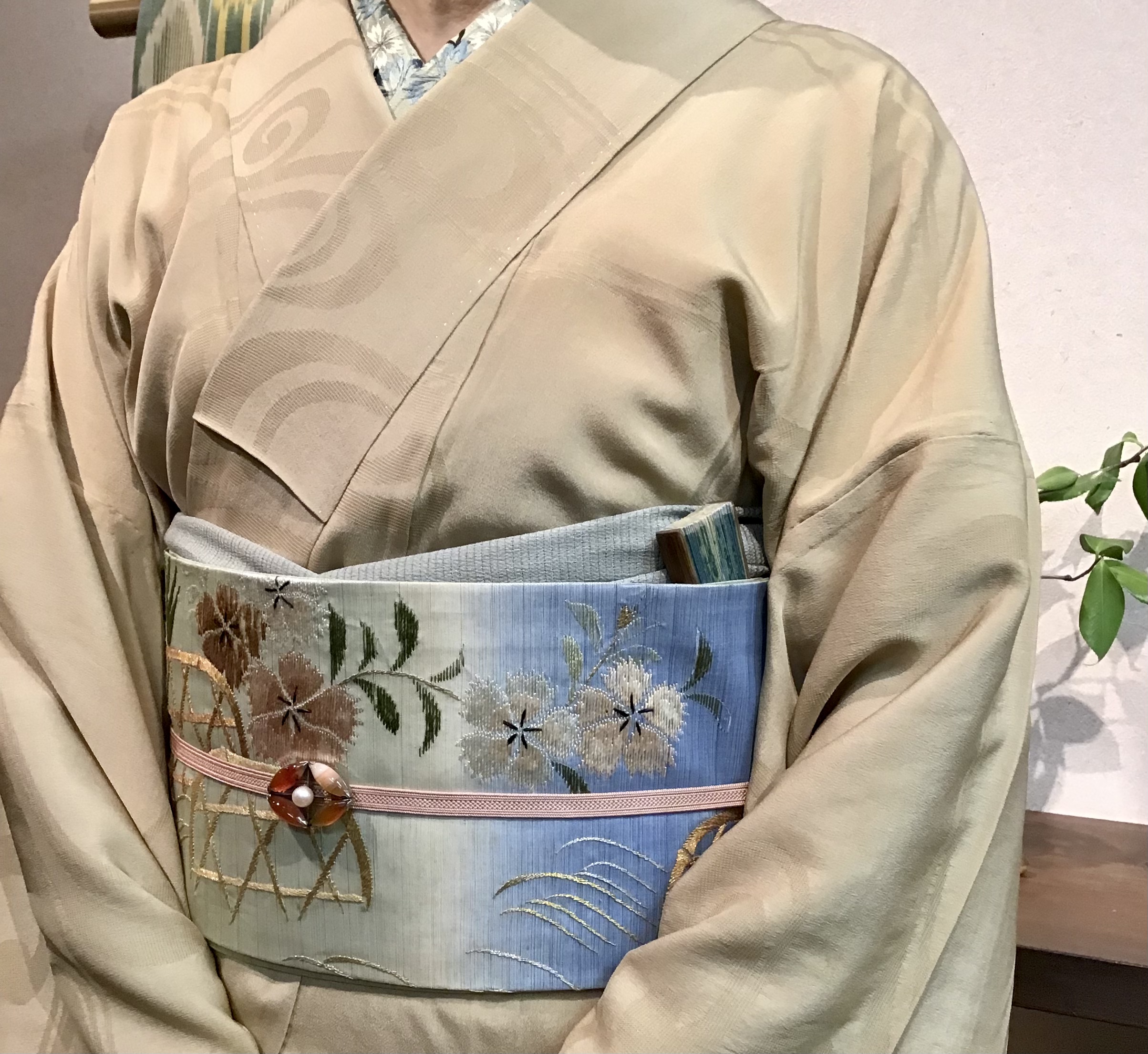 青磁色桔梗尽くしのたおやかな小紋に刺繍帯が、華やかさを添えます。