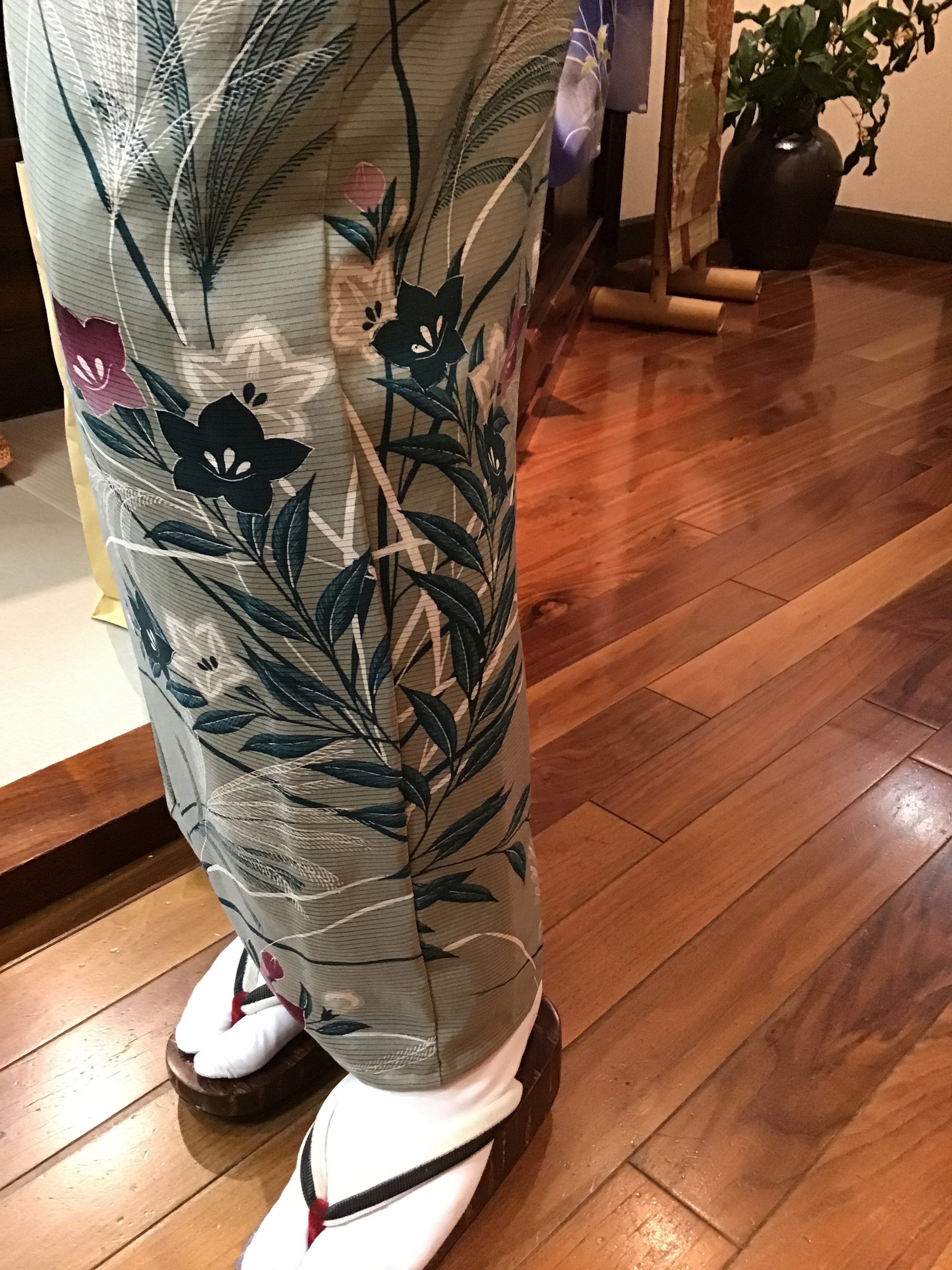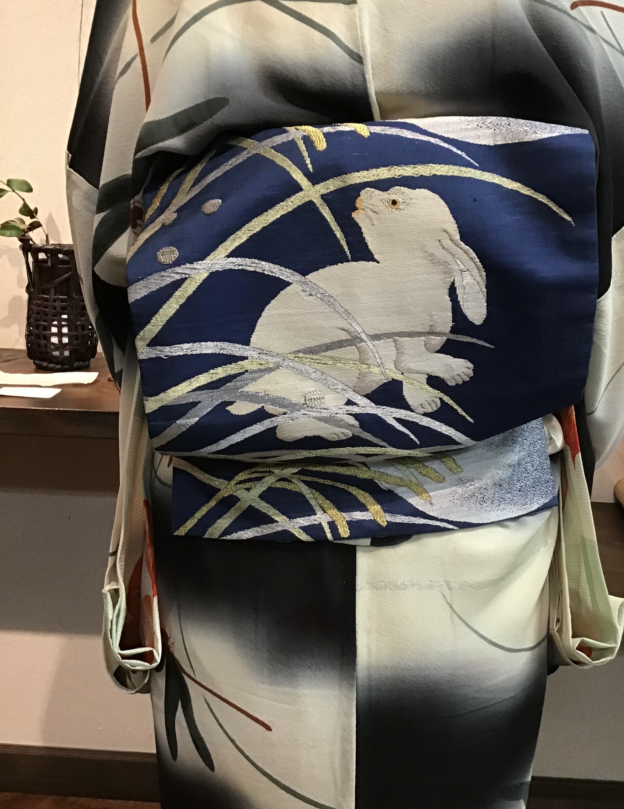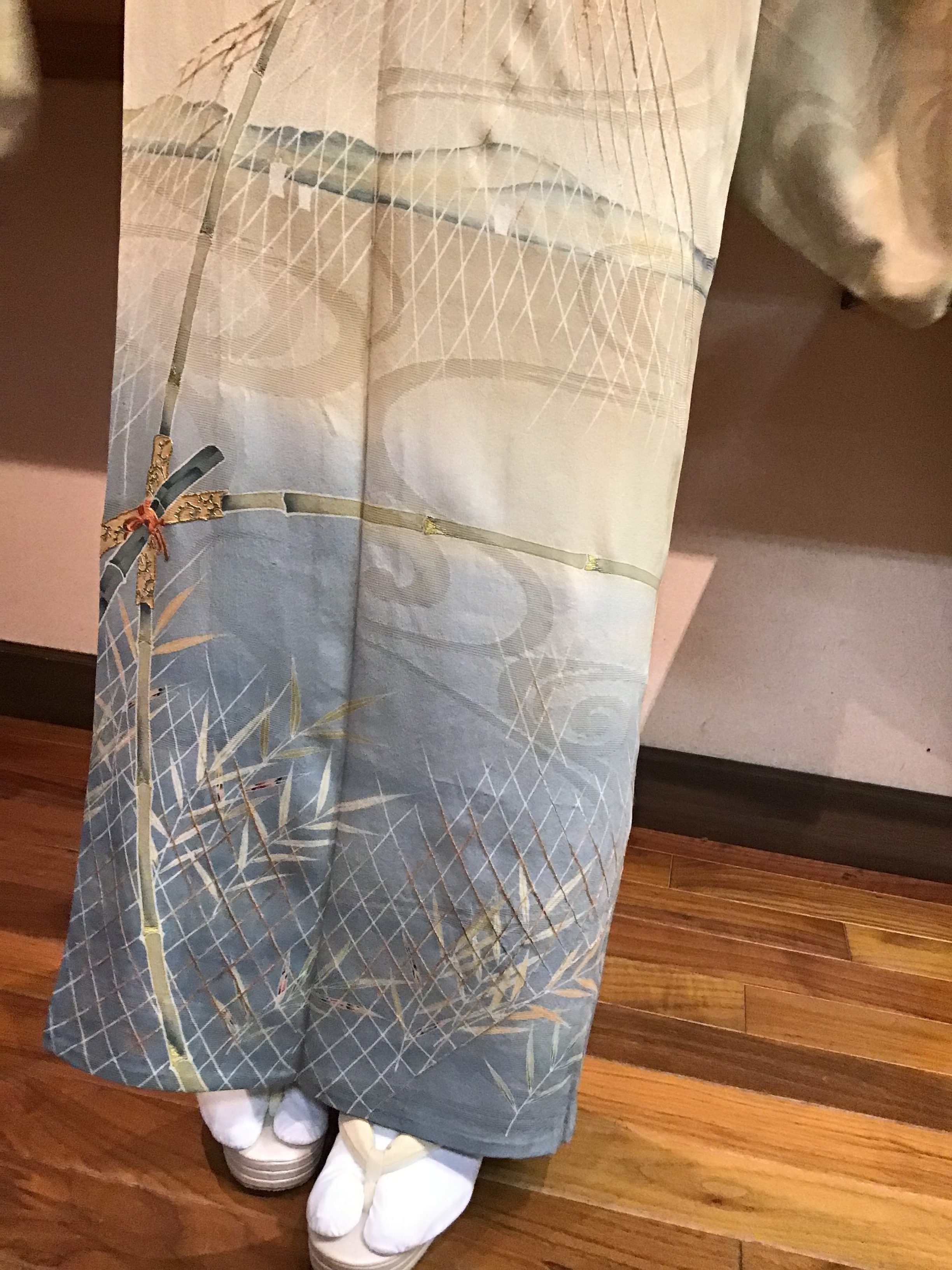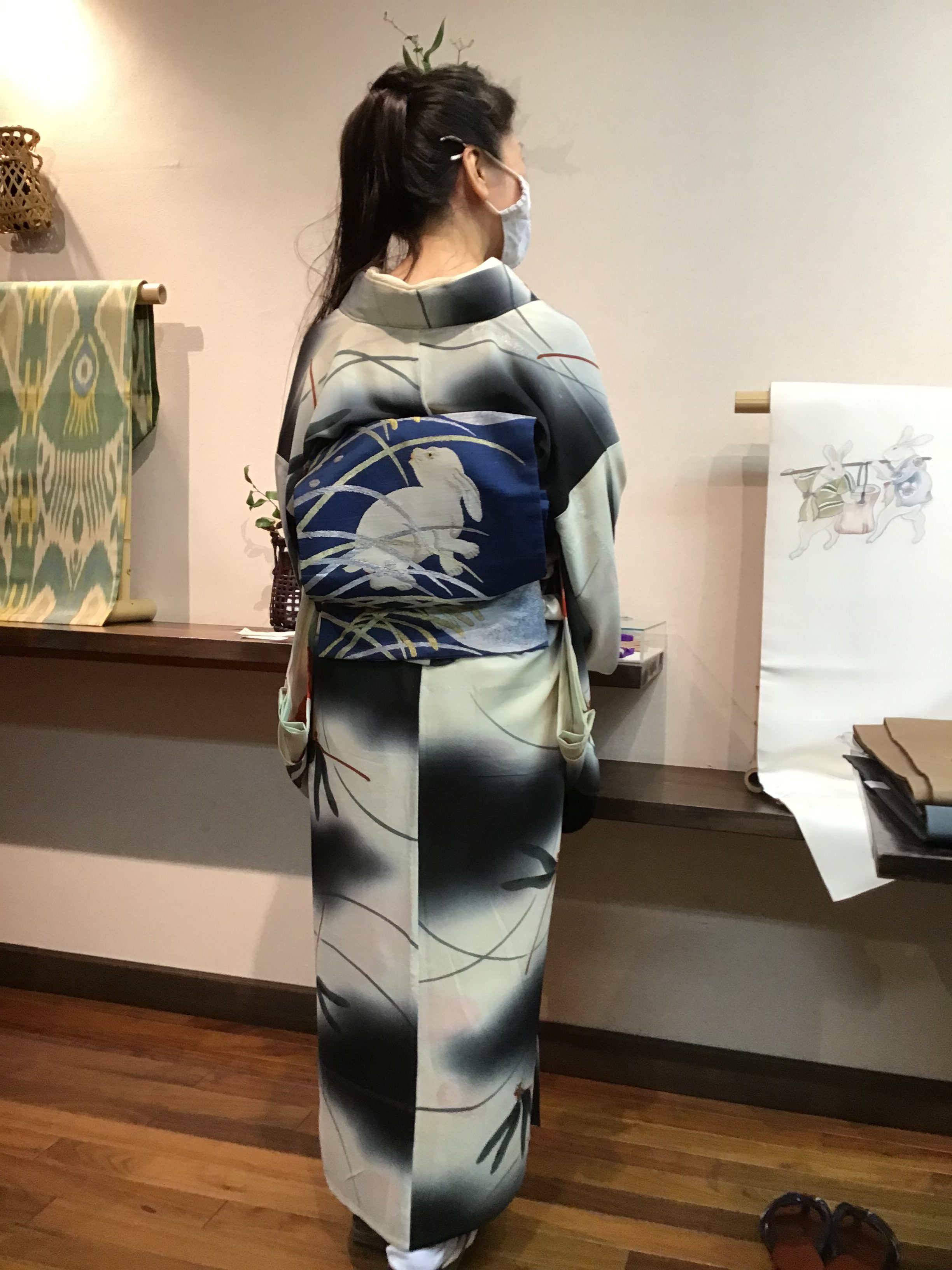 青磁色桔梗尽くしのたおやかな小紋に刺繍帯が、華やかさを添えます。