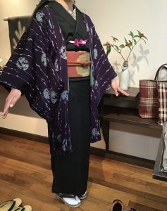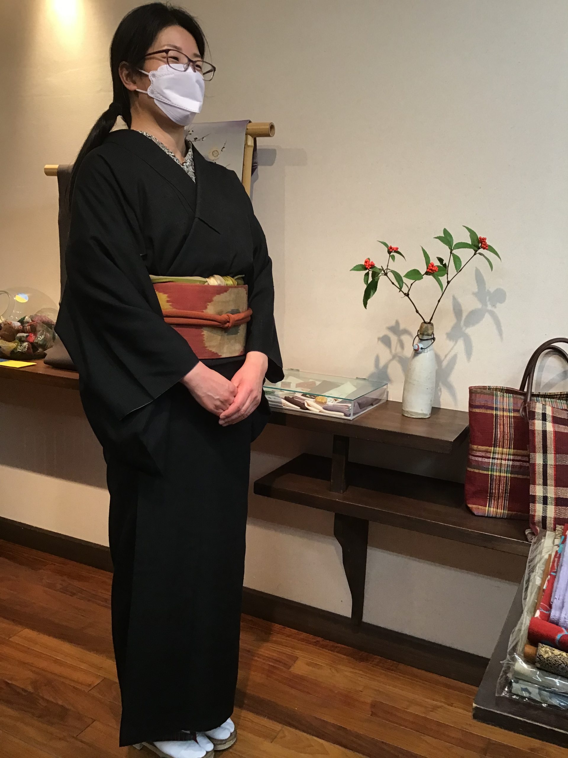 羽織の下は、マニッシュな黒の結城紬に大胆なウズベキスタンアドラスの帯。長身にピッタリ