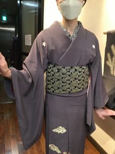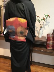 古い時代の三つ紋の訪問着に、丸帯崩しの半幅帯を合わせて