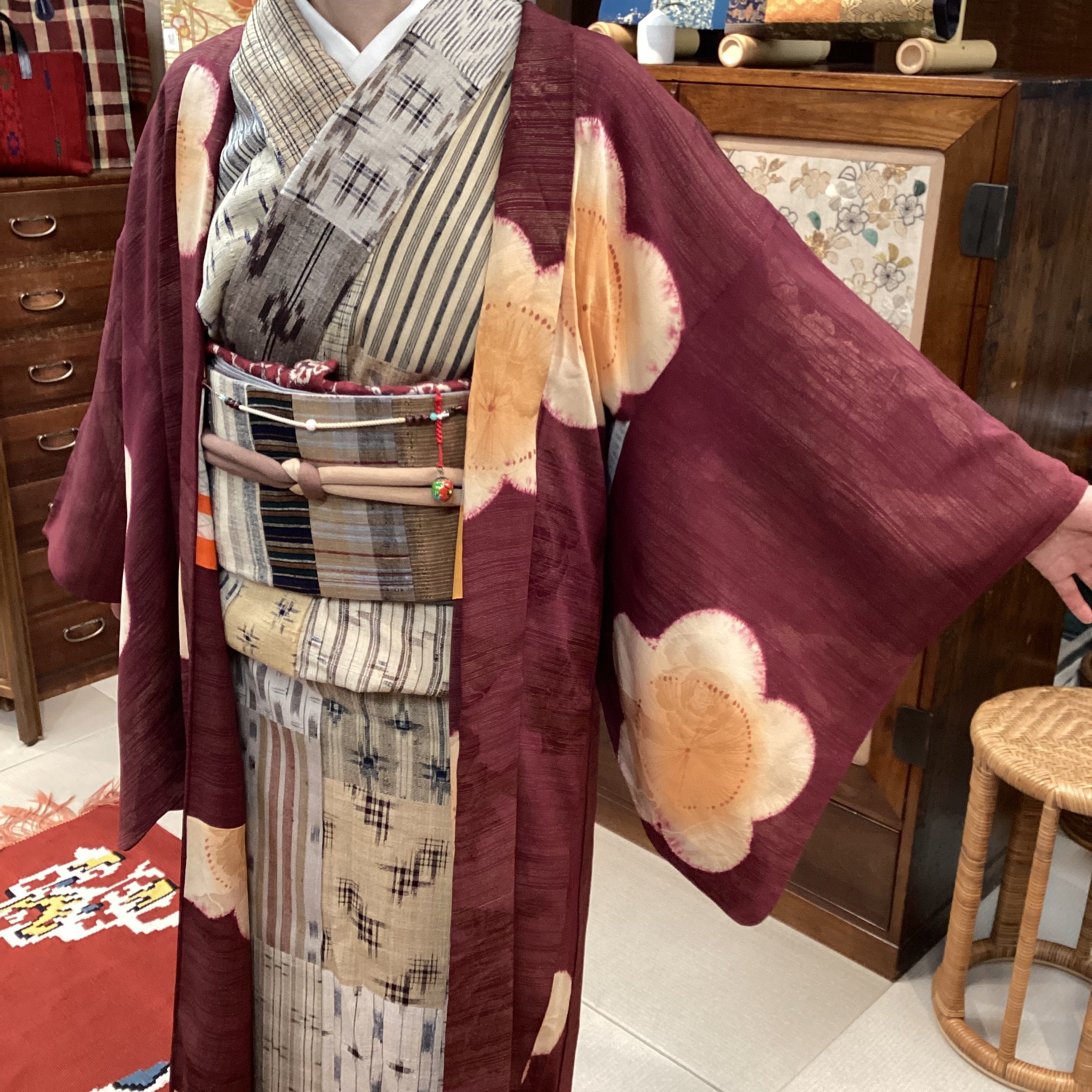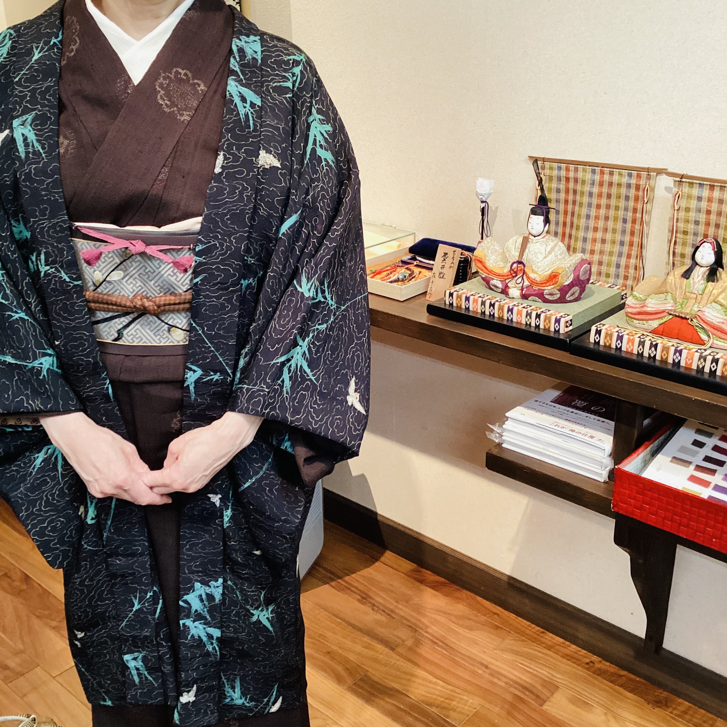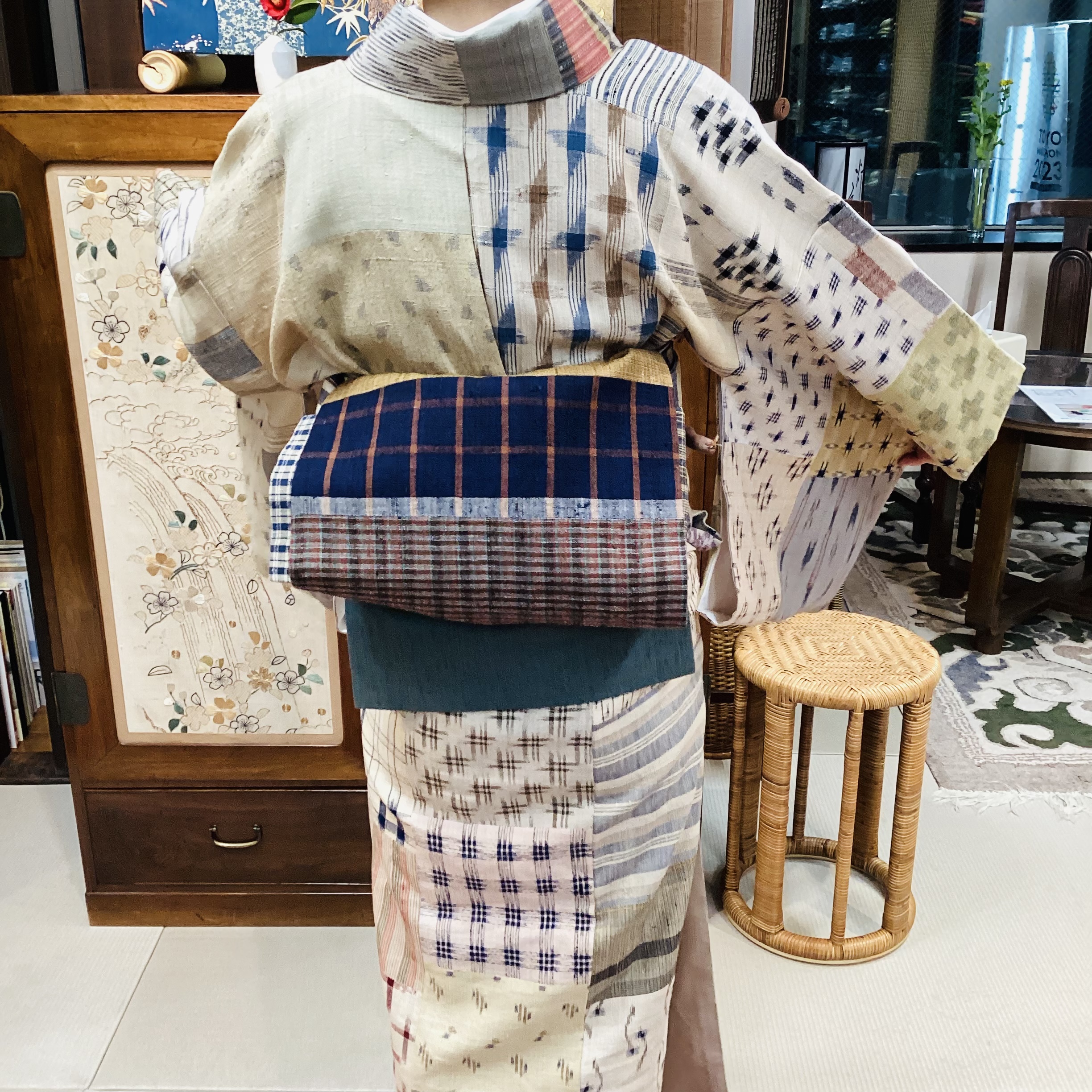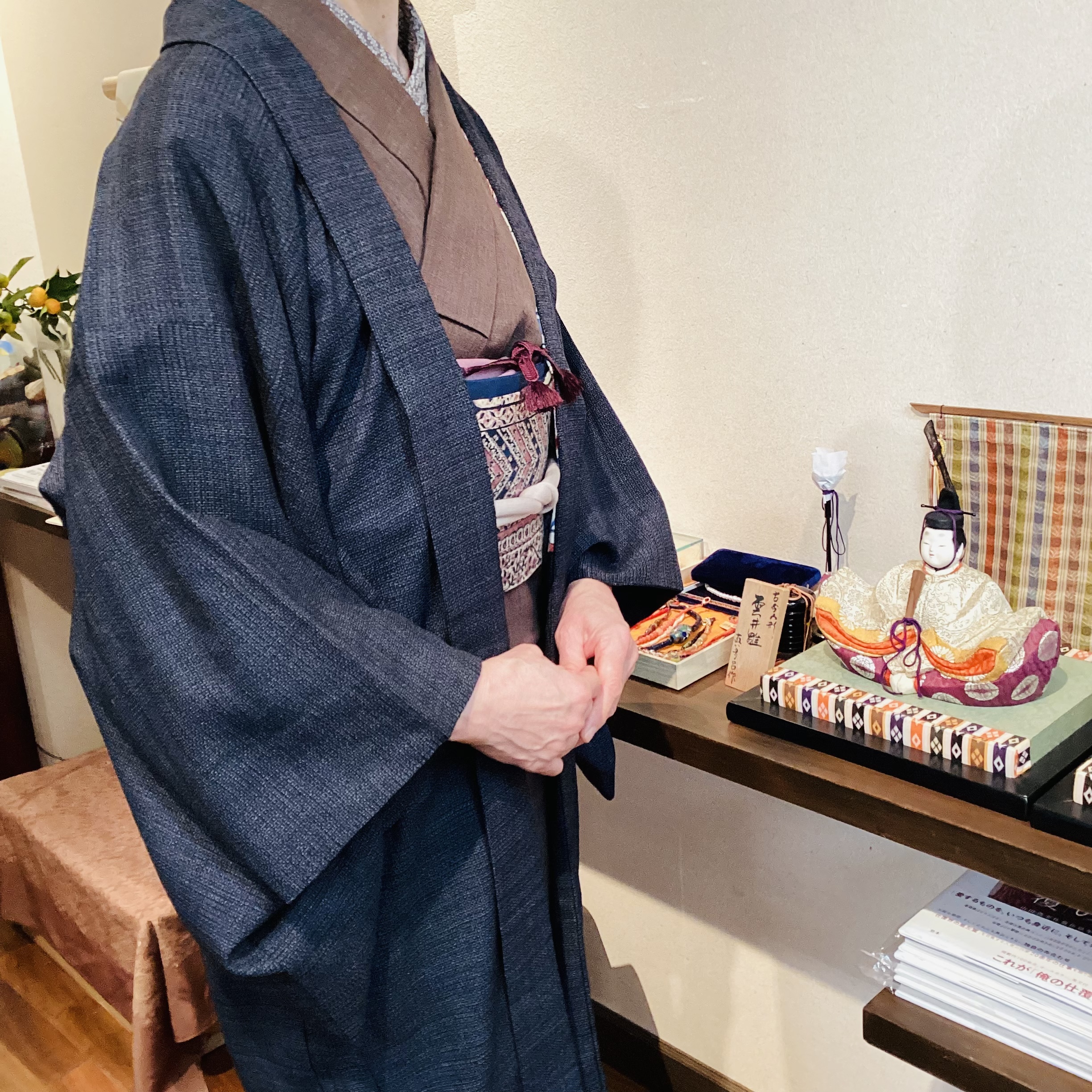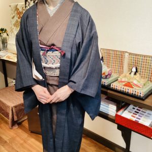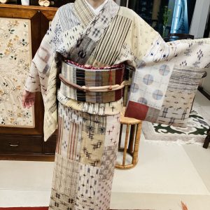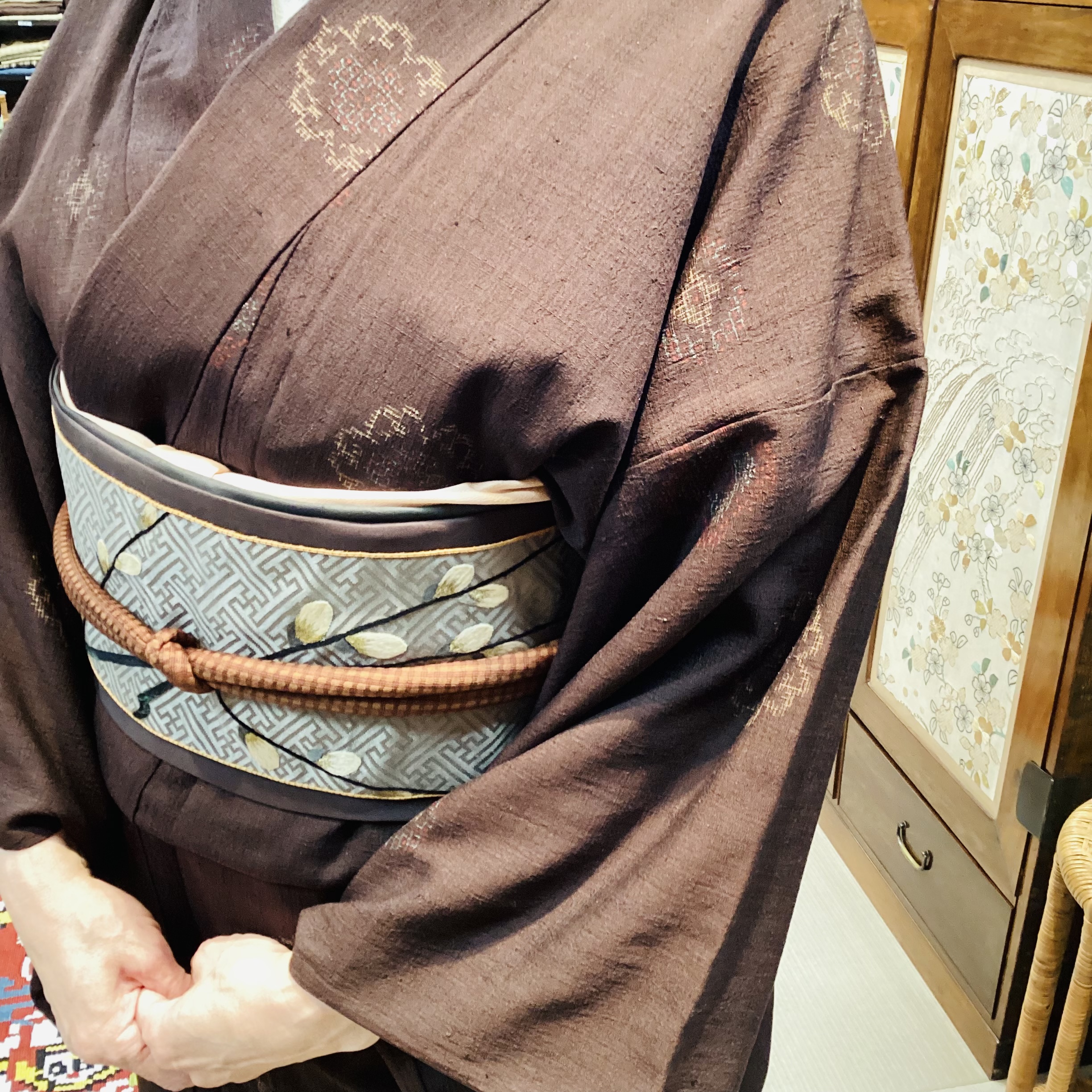 結城縮の着物にインド更紗の帯でシックにまとめて