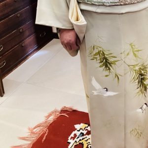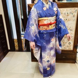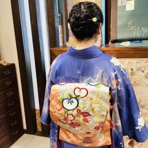 卒業式に当店でアンティークのお着物を選ばれたお客様。季節に合わせた桜模様の金紗の中振袖に名古屋帯でありながら豪華な刺繍という組み合わせ。とても軽やかで個性が光る装いでいらっしゃいました。