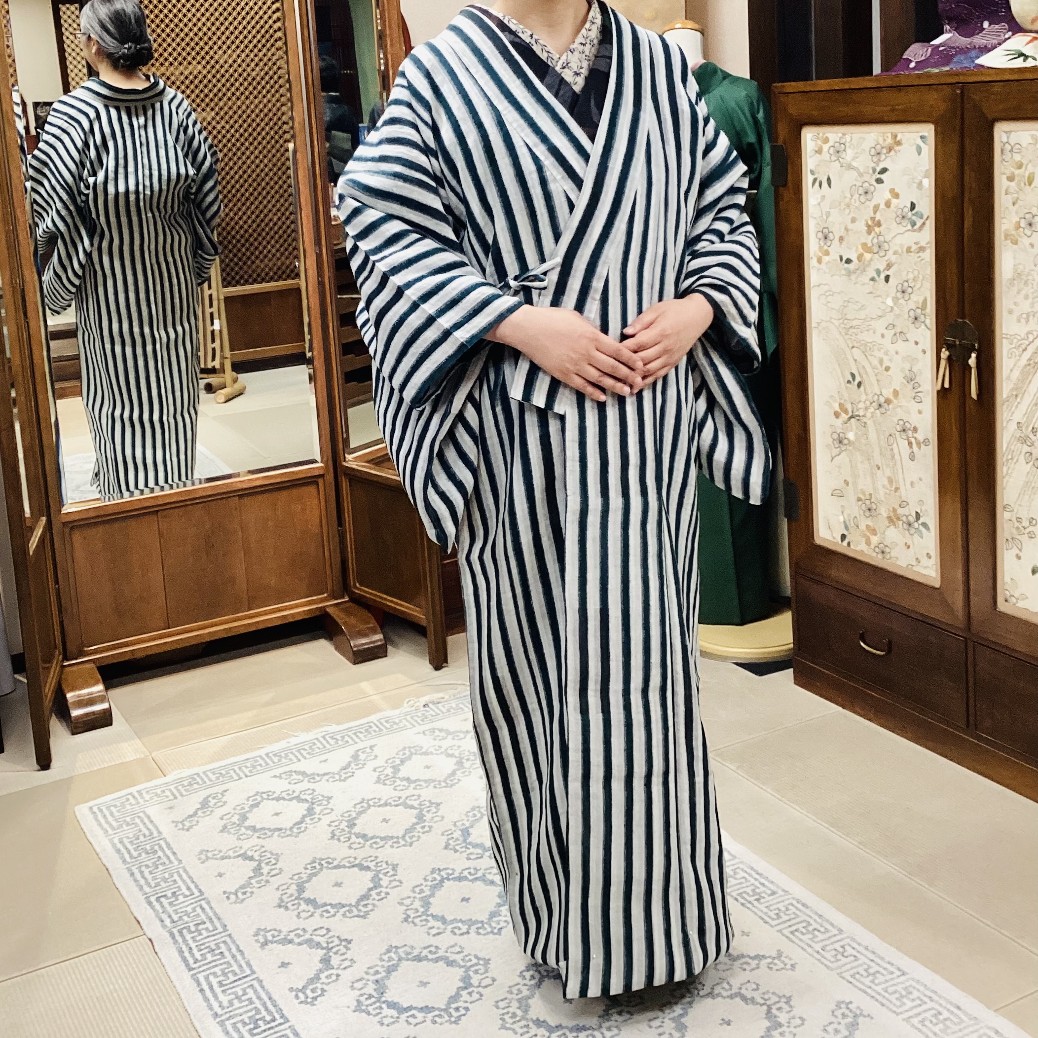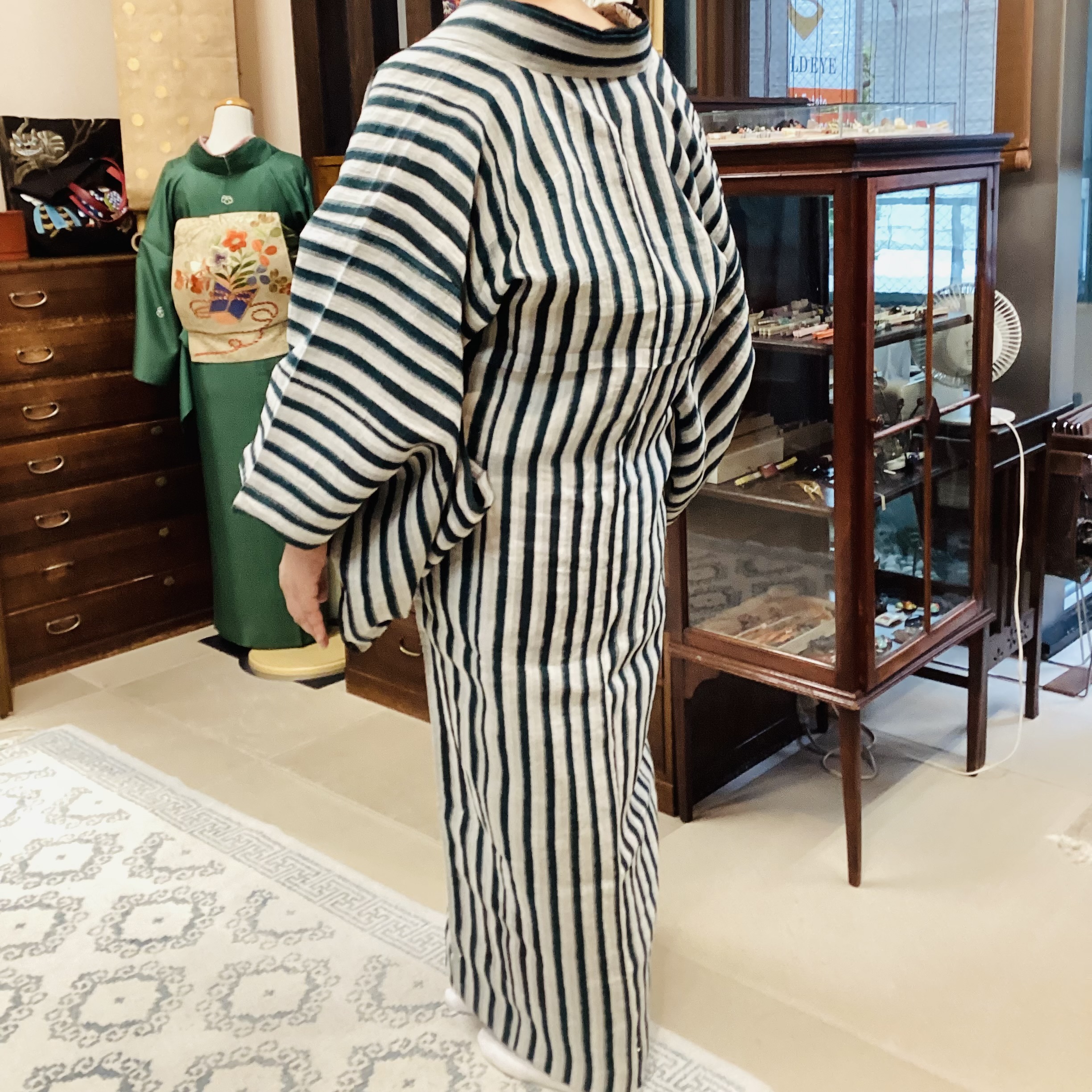 こちらのお客様は小千谷縮。深い緑と灰色がかった白の大胆な縞。粋ですっきりとした風情のあるコートになりました。