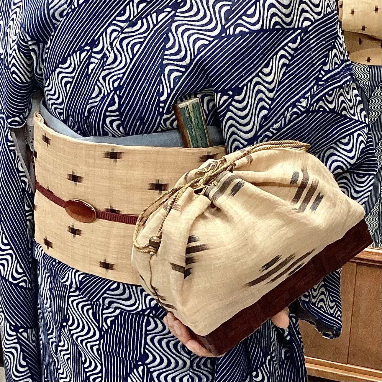 この日は、恒例の「沖縄工芸展」からの帰りにお立ち寄りくださいました。帯と籠は昔の芭蕉布の着物から作った灯屋2オリジナル。