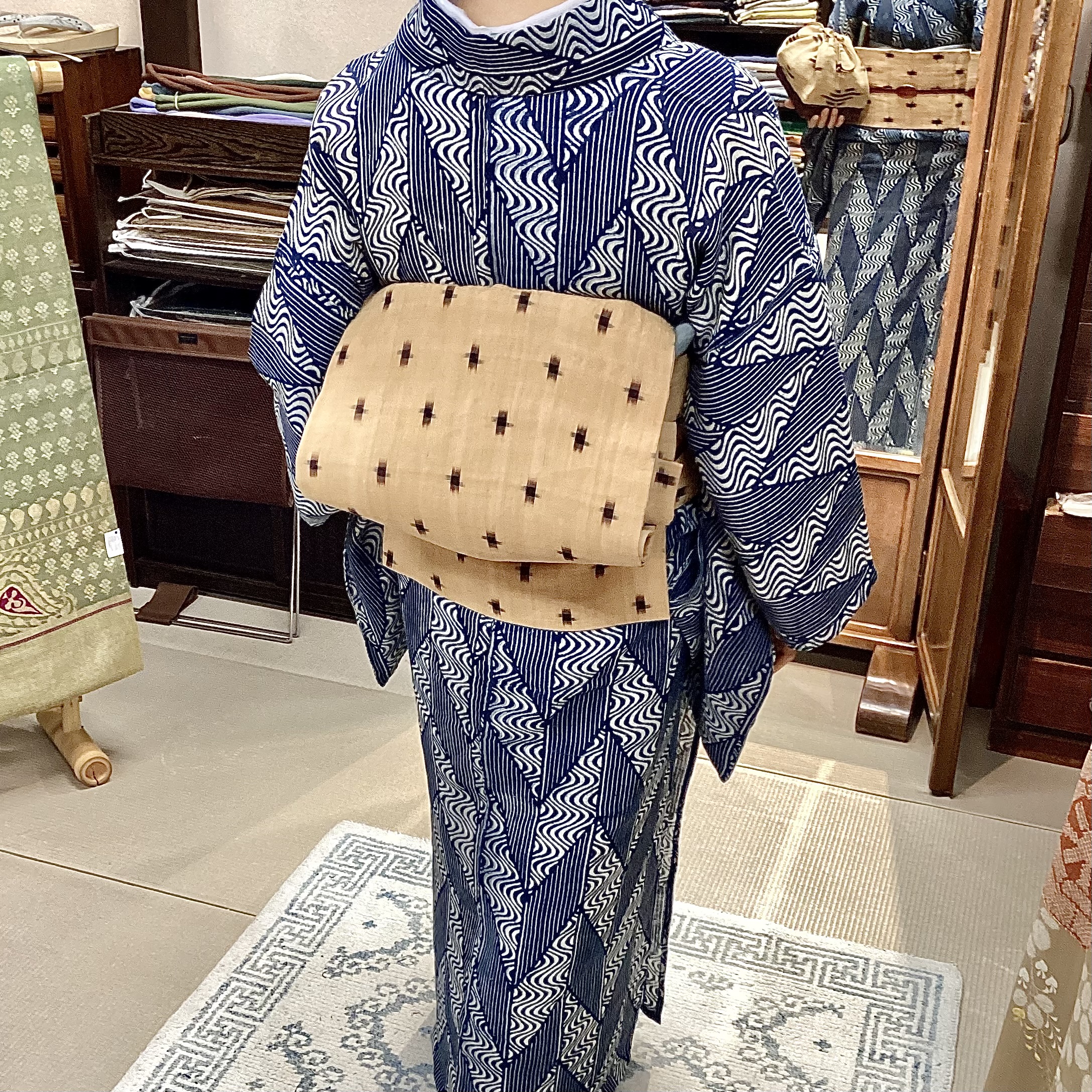 こちらは自然の温度で藍を発酵させるという、正藍冷染の大麻の着物。力強い色合いと模様、風合いが他のどの着物とも異なる個性を放っていますね。
