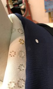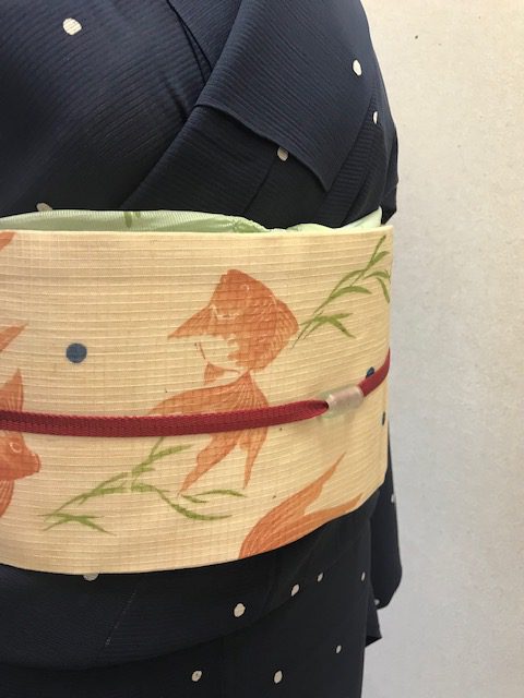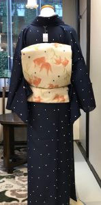 帯は水文様に織り出された紗の袋帯でスッキリと、瑪瑙の帯留めをワンポイントにしてみました。