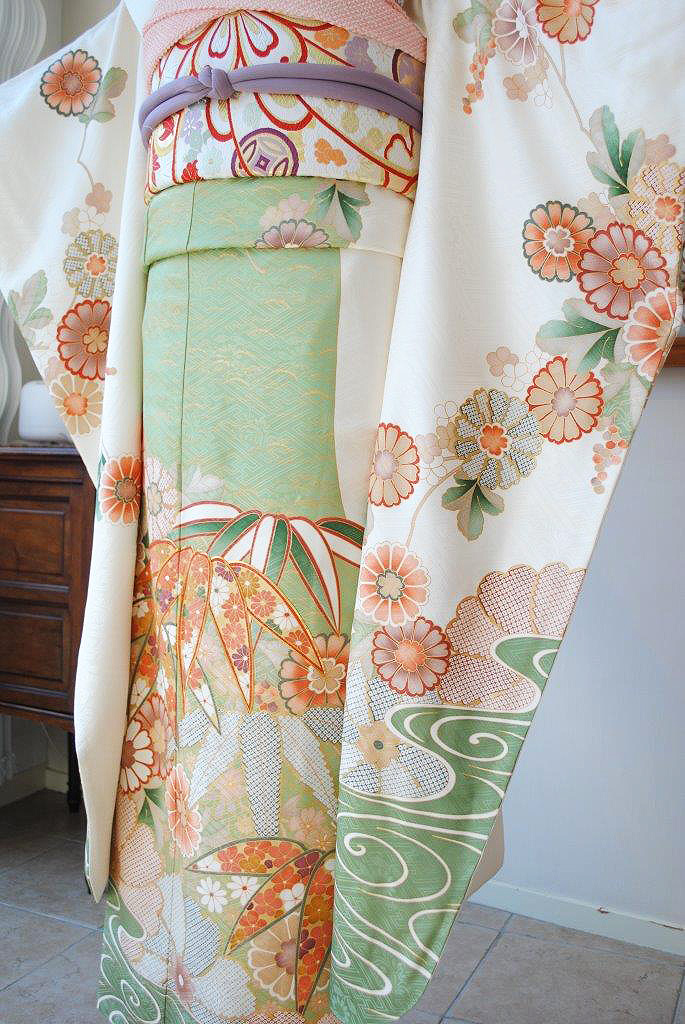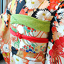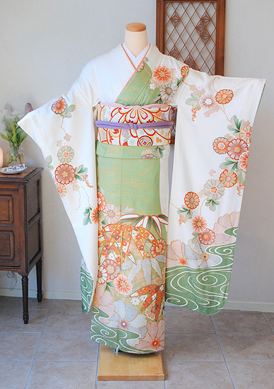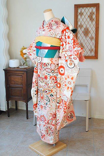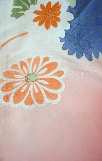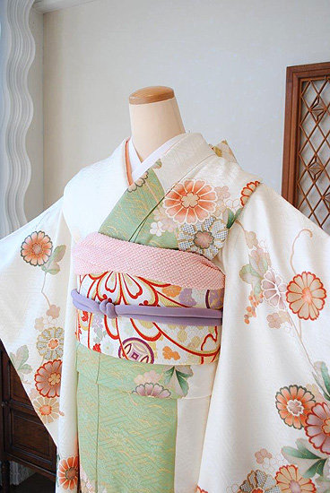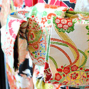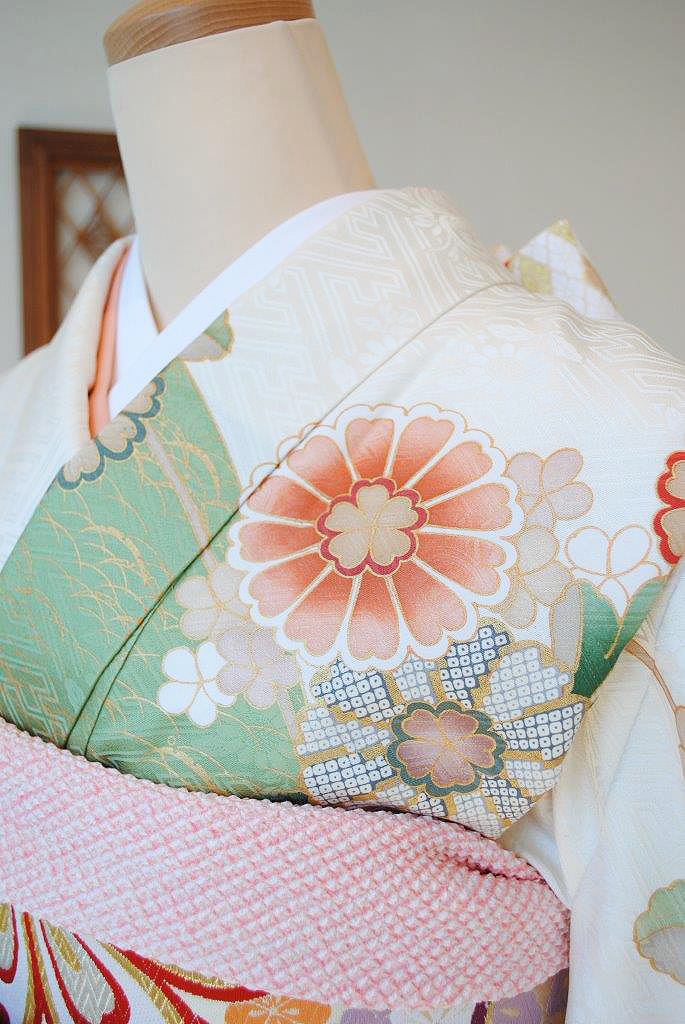 アンティークならではの柔らかな錦紗地に優しいぼかしの染色とふんわり漂う菊の花が何とも可愛らしく、上品な振袖姿を演出します。