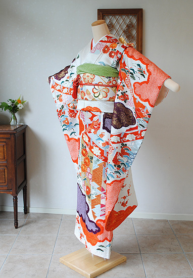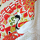 花車に冊子文様錦紗縮緬振袖