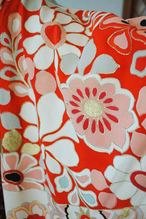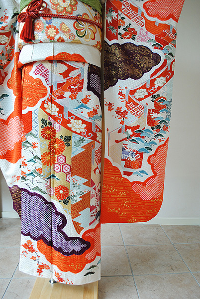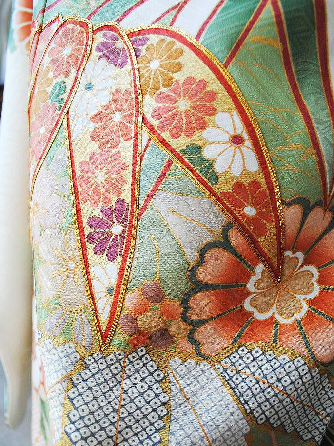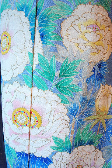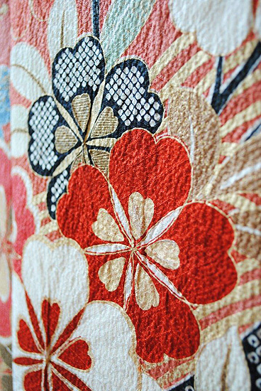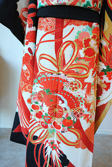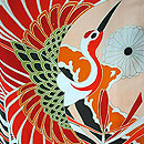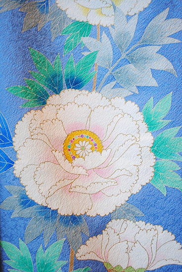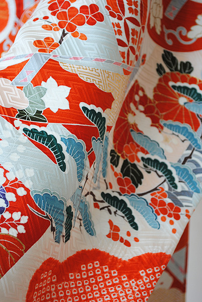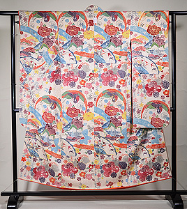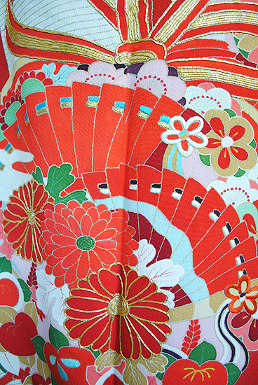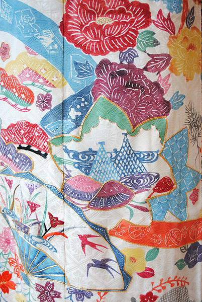 末広がりの未来を意味する扇面、羽を広げて飛翔する鶴、枝垂れ桜に満開の牡丹、網干文様と古くから親しまれてきた伝統文様が所狭しと染められています。