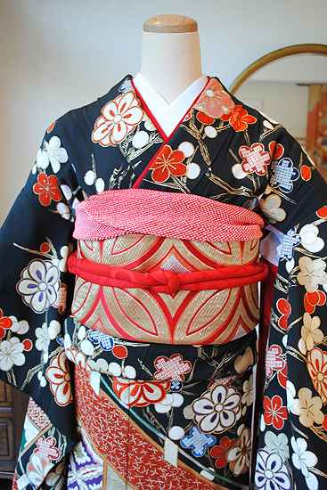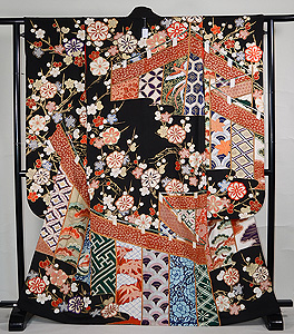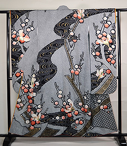 梅に幔幕文様刺繍縮緬大黒振袖