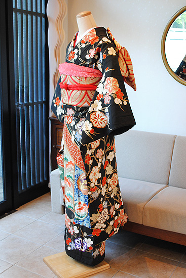 大胆な雪輪に可愛らしい桜が配された黒地の振袖。