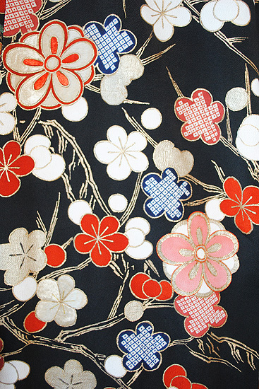 厚手の縮緬地にびっしりと描かれた梅文様と幔幕の文様。