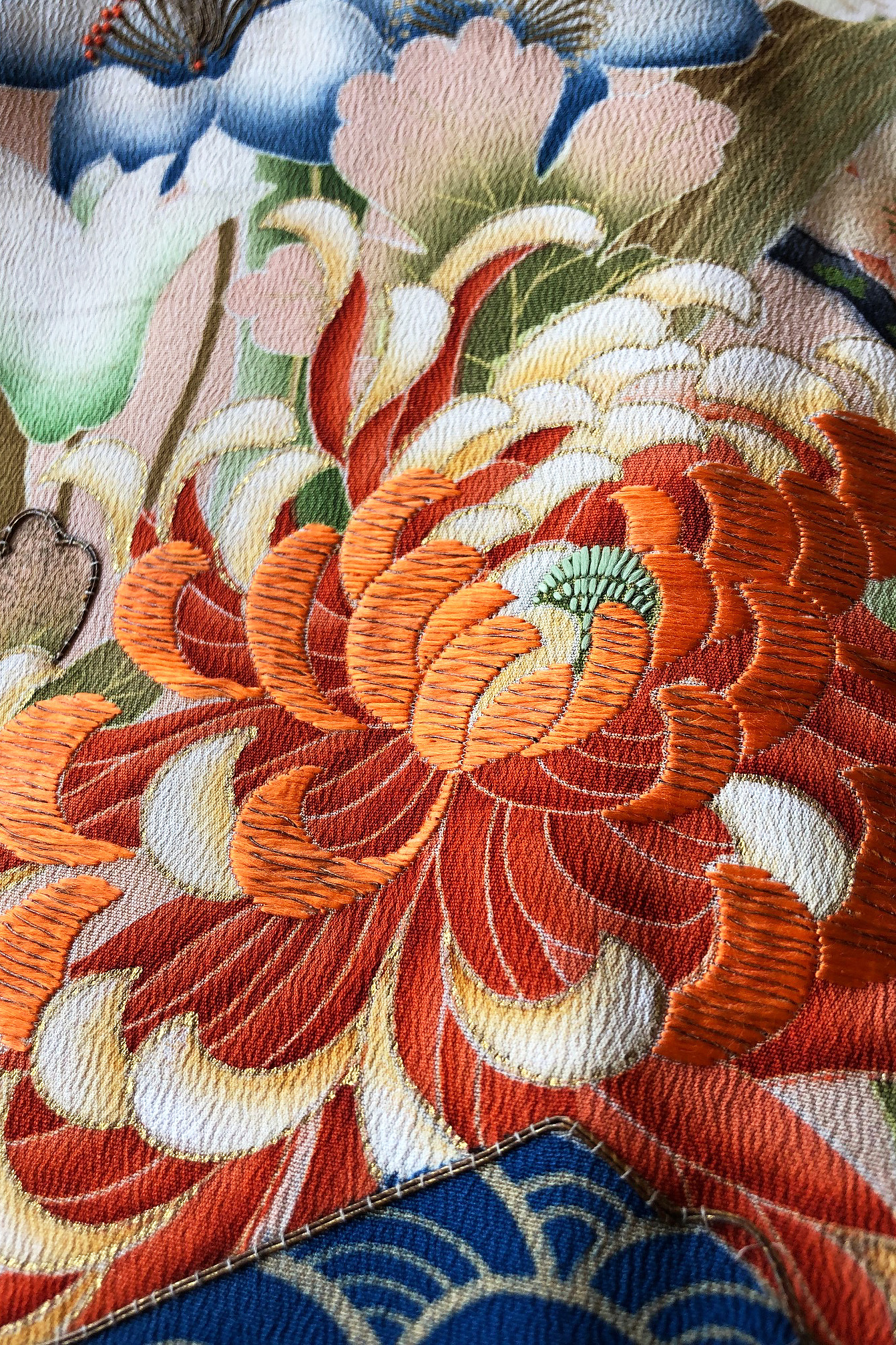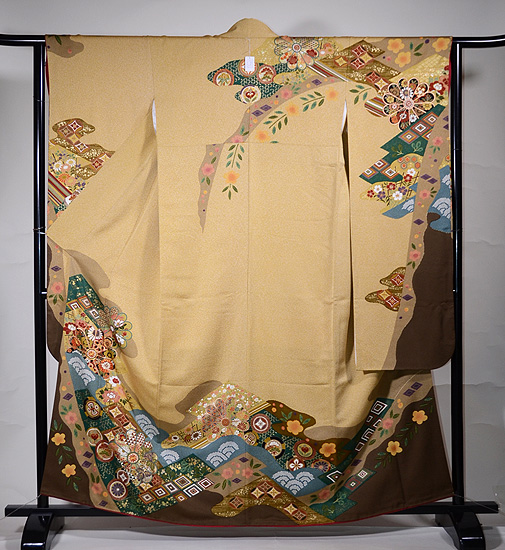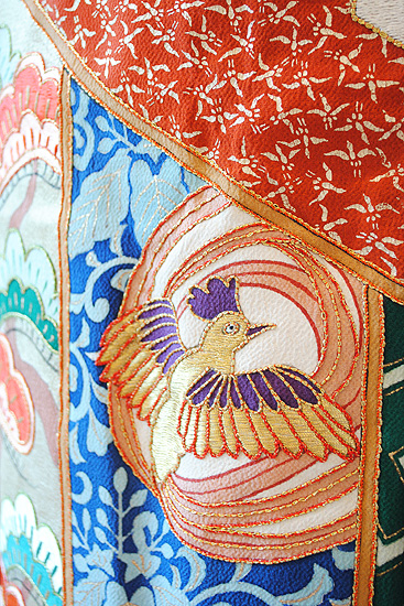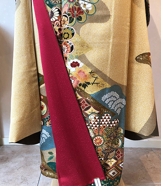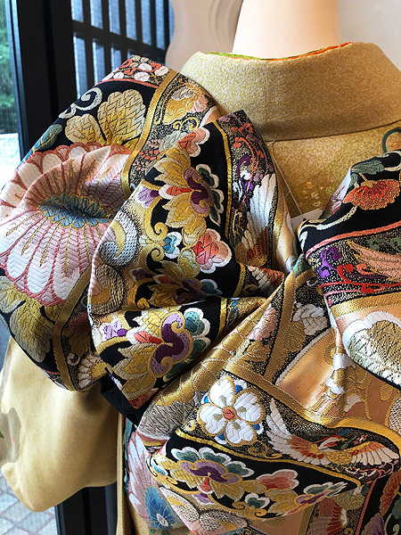 錦糸を表した部分には金駒刺繍が重厚にあしらわれ、かつて豪華な花嫁衣装として使われていた名残を感じさせます。