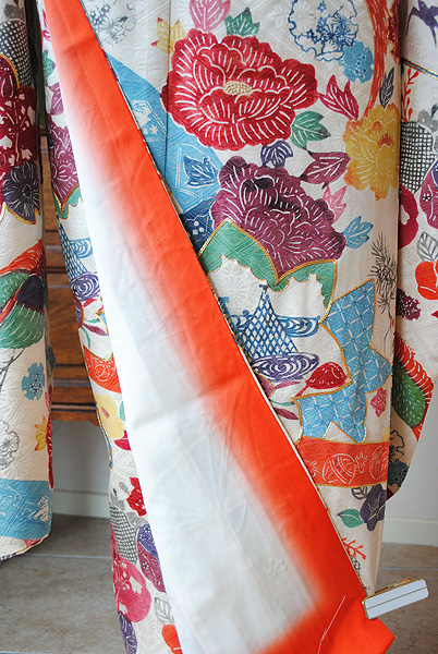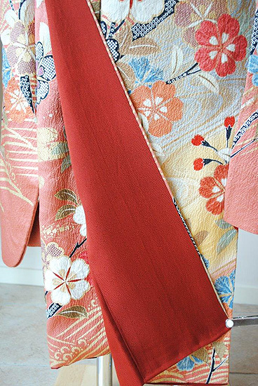 袖のふきと裾の比翼には十二単のように朱、黄、抹茶の生地がのぞき、ポイントとなっています。