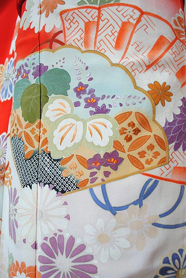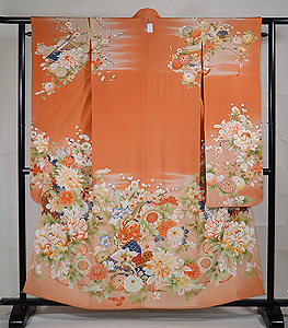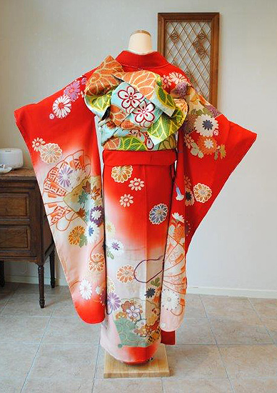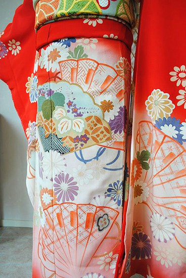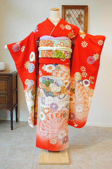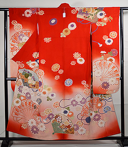 朱赤地檜扇に菊花ぼかし振袖