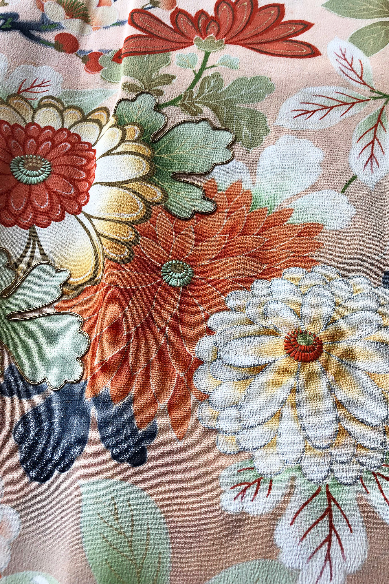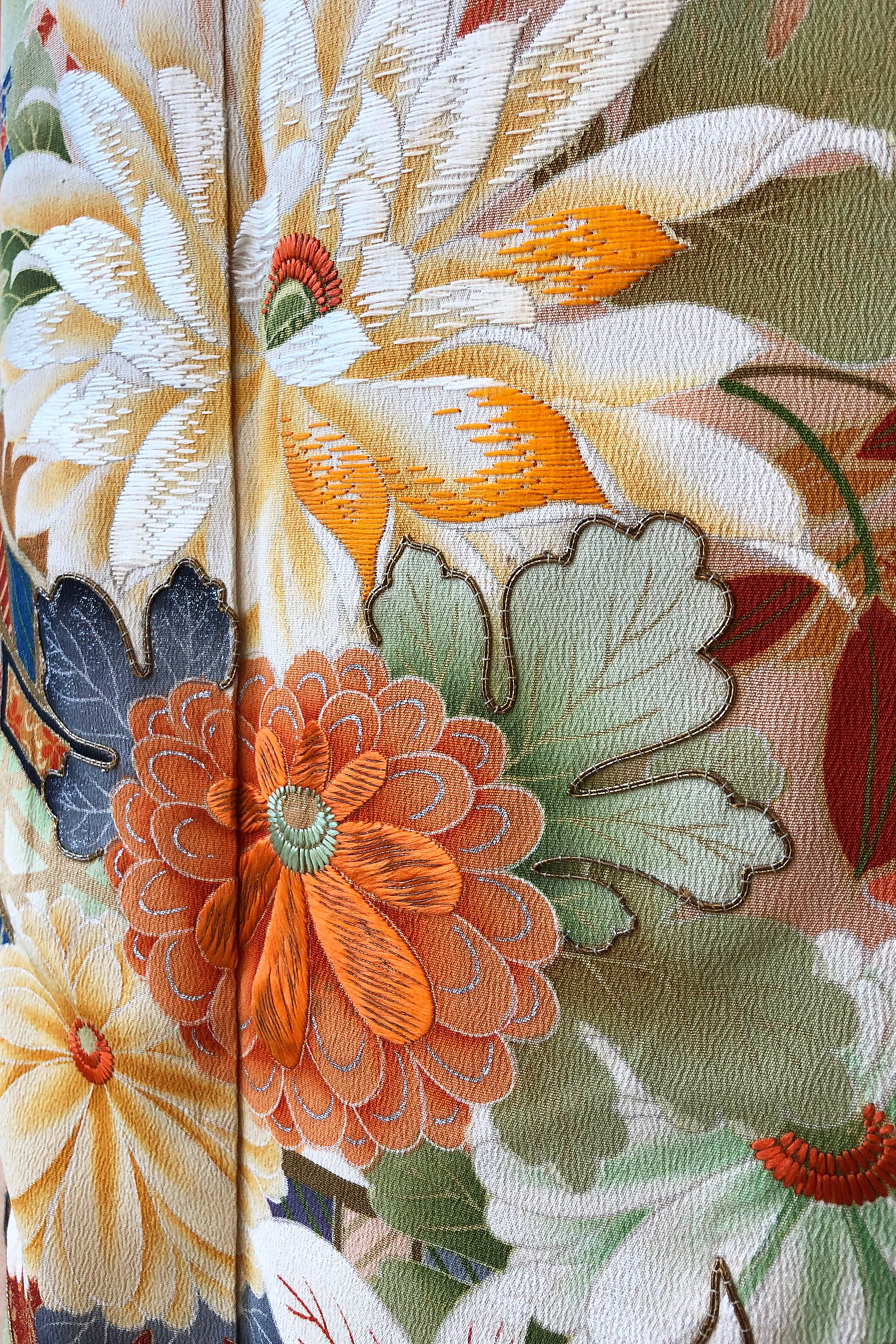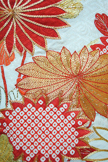 手の込んだ日本刺繍と金駒刺繍で菊、梅、桜の花々が縫い上げられており、まっさらな白綸子と相まって堂々とした武家の女性を連想させるようです。