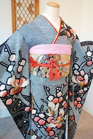 総絞り槍梅に鶴文様振袖