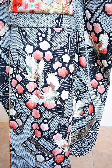 咲き始めた梅林の中を鶴の群れが飛ぶ、情緒あふれるリサイクル振袖です。