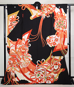 御簾に花薬玉文様刺繍黒振袖