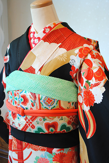 上質な縮緬地は一目で布地の良さが伺え、この時代のものにしては珍しく色焼けがない漆黒の振袖です。