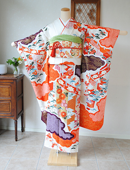 橙色と紫色のコンビネーションが可憐な印象の振袖、こちらは現代物リサイクル品となります。