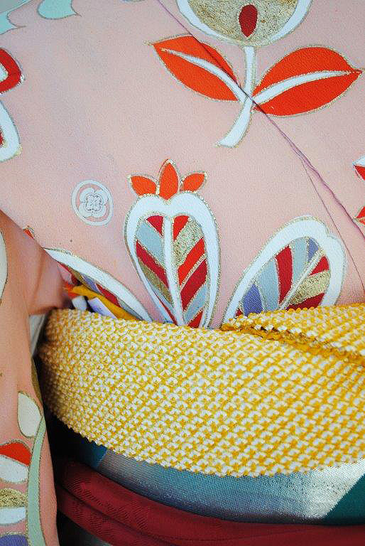 現代の振袖よりも細い絹糸を用いた錦紗縮緬地は、柔らかい素材感ではんなりと身体に沿い、優しい着心地。