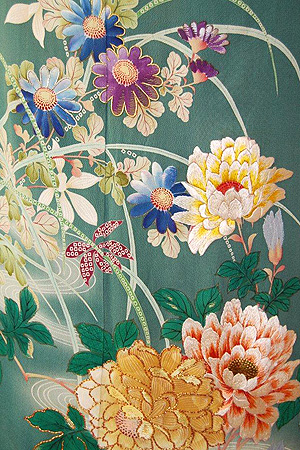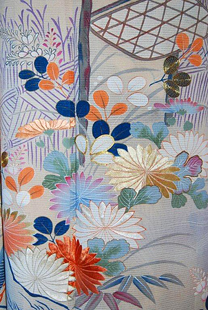 菊や萩などの花にはところどころ刺繍がなされ、絹糸の光沢感が美しく、