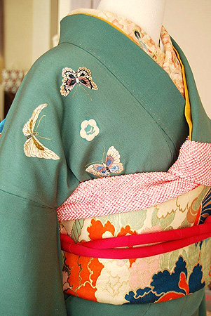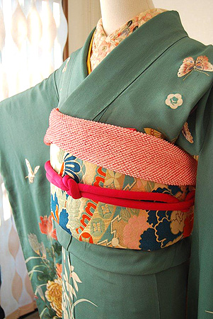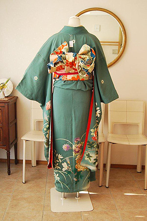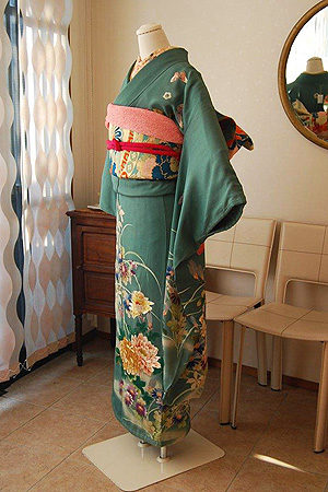 珍しい翡翠色の地が目を引くアンティーク振袖。