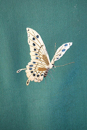 幼虫からさなぎを経て美しい蝶へと変貌する過程を古くから女児に例え、女性の晴れ着に用いる吉祥文様として愛されてきた蝶々の図案。