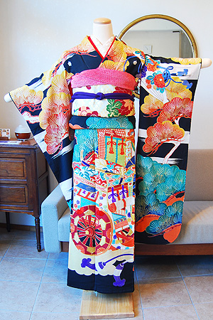 松に御所車文様黒振袖