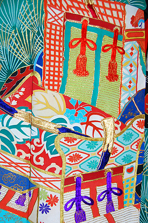 全体に金銀の四角形の箔が散りばめられ、晴れの日の相応しいおでめたい文様となっています。