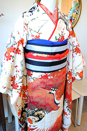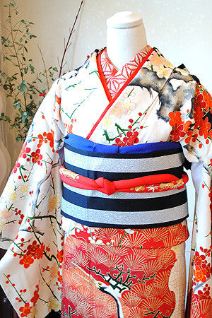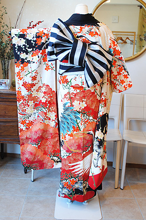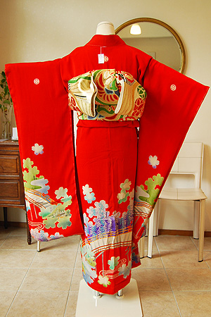 吉祥文様である松を袖に配し、紅白の見事なまでのバランス。