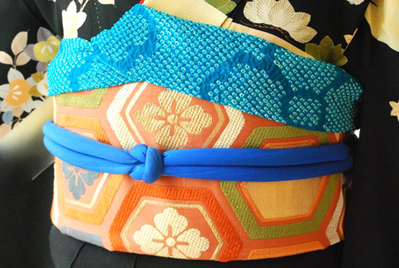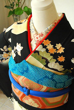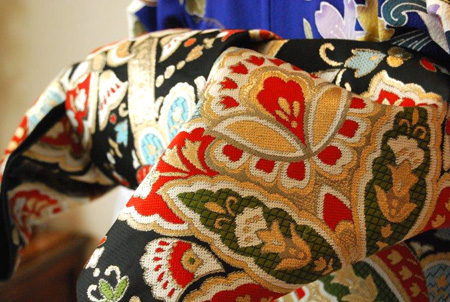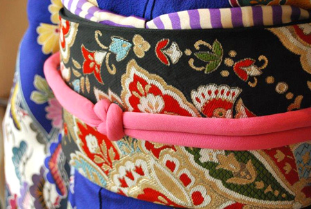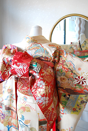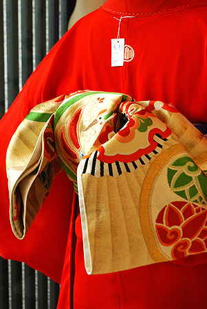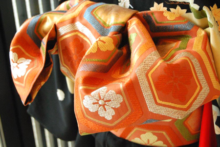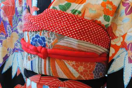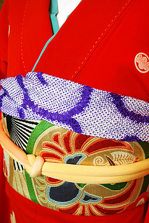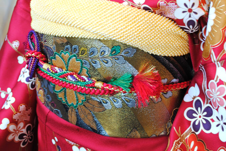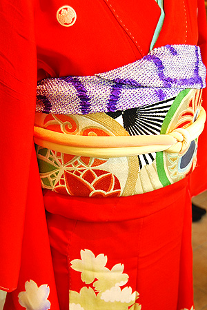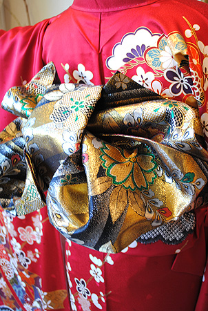 写真のように赤い帯で若さを出しても、ゴールド系の帯を合わせて上品に装うのも似合います。