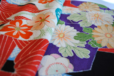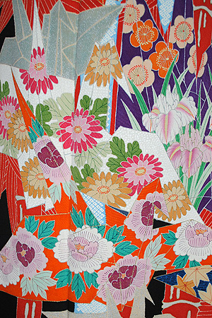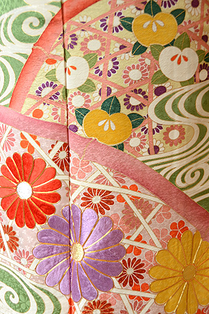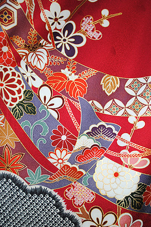 光の当たり具合によって菊の地模様が浮かび上がる上質な縮緬正絹地に桜、菊など四季折々の花々、檜扇文様が描かれ、上品な印象。