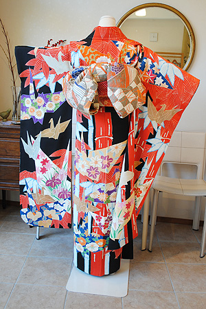 黒地に朱赤という古典的な組み合わせの色使いが優しい雰囲気でお嬢様の魅力を更に引き立てることだと思います。