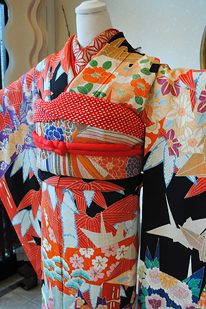 珍しい折り鶴文様が愛らしく、菊や桜、椿など四季折々の花が描かれ情景豊かな図案です。