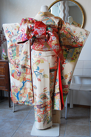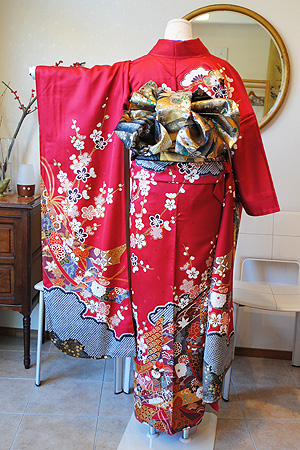 梅と水仙、春の花も加わり艶やかでアンティークらしい雰囲気に満ちた一着。
