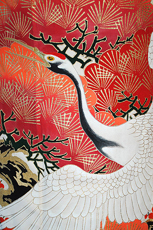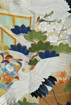 鶴の部分には手刺繍が施され、図案の立体感を高めています。