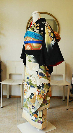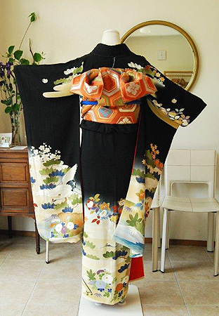 孔雀は悪い虫などを食べてくれることから特に女性の守り神と言われ、その華やかな姿とあいまって振袖によく描かれています。