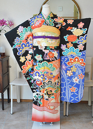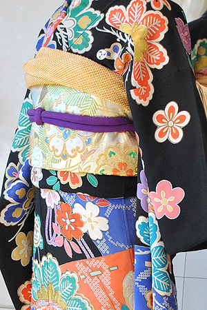 刺繍の立体感、文様の美しさ、黒地ということを忘れさせるような華やかさです。